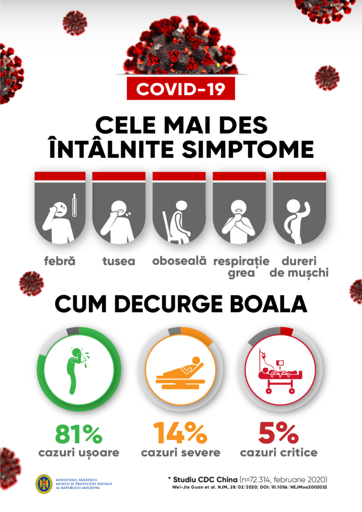 Cele mai des întâlnite simptome ale COVID-19 sunt febra, oboseala și tusea uscată. Unii pacienți pot prezenta dureri, congestie nazală, nas curgător, dureri în gât sau diaree. Aceste simptome sunt de obicei ușoare și încep treptat. Unele persoane se infectează, dar nu dezvoltă niciun simptom și se simt bine. Majoritatea oamenilor (aproximativ 80%) s-au tratat fără un tratament special. Aproximativ 1 din 6 persoane cu COVID-19 devine grav bolnavă și prezintă dificultăți de respirație. Persoanele în vârstă, precum și cele cu probleme medicale, cum ar fi hipertensiunea arterială, probleme cardiace sau diabet, sunt mai susceptibile să dezvolte o evoluție mai gravă a bolii. Aproximativ 2% dintre persoanele bolnave au decedat. Persoanele cu febră, tuse și dificultăți de respirație trebuie să solicite ajutor medical.